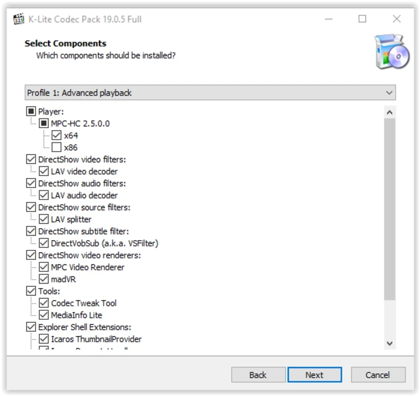 إنها مجموعة صغيرة من جميع فلاتر DirectShow الضرورية، ولا تحتوي على مشغل. مع ذلك، يمكنك استخدام مشغل DirectShow المثبت مع هذه الحزمة، ويحتوي نظاما Windows 10/11 على إصدار حديث من Windows Media Player، ولكنه غير متوافق مع حزمة ODEC، لأنه لا يستخدم DirectShow.